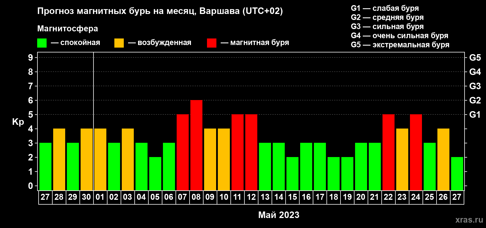 Прогноз магнитных бурь в Варшаве — 27 апреля 2023 года