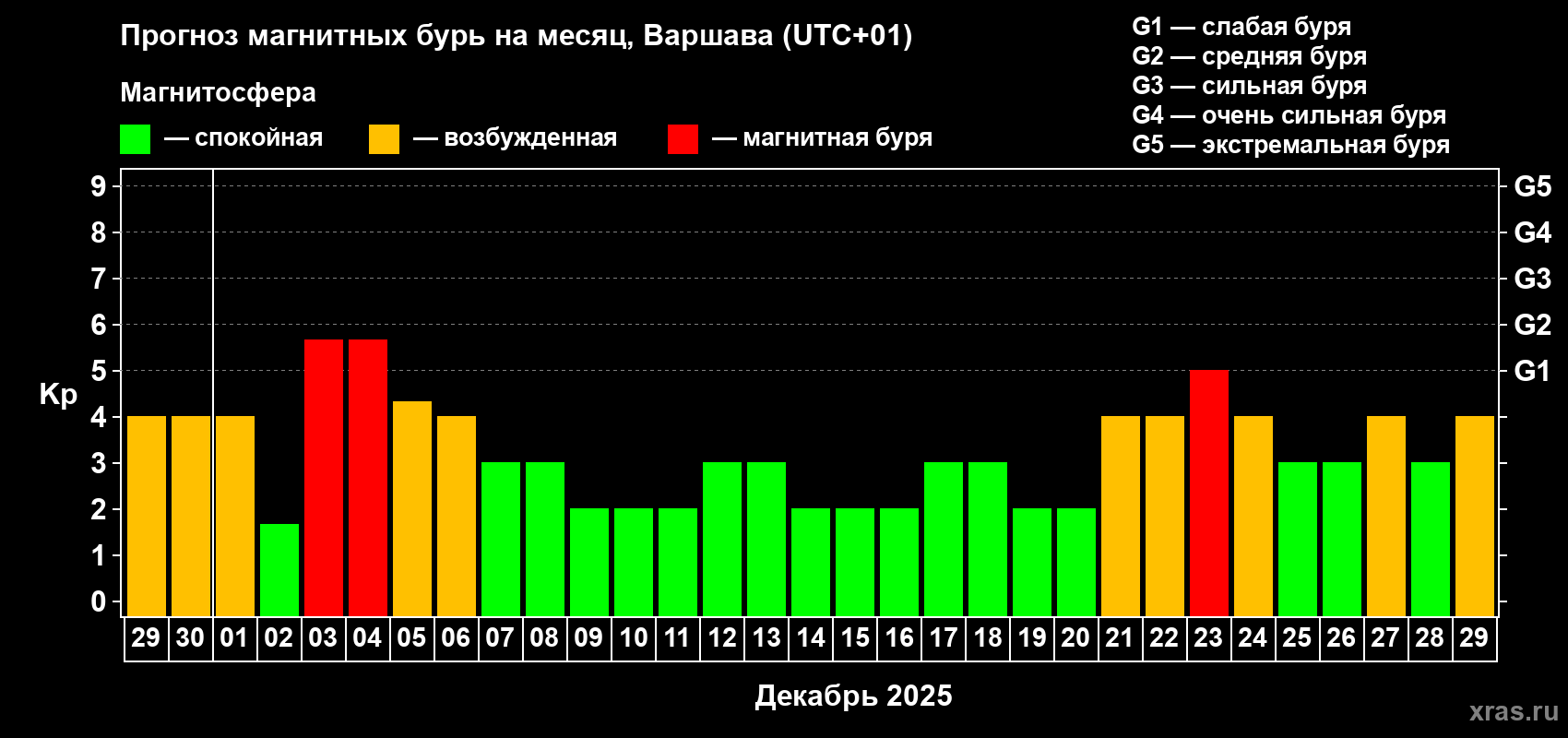 Прогноз магнитных бурь в Варшаве — 29 ноября 2025 года