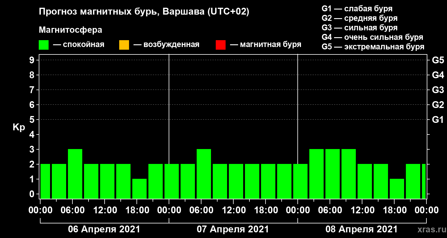 Прогноз магнитных бурь в Варшаве — 6 апреля 2021 года