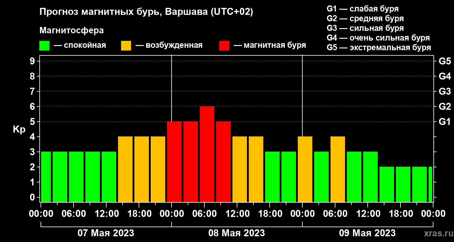 Прогноз магнитных бурь в Варшаве — 7 мая 2023 года