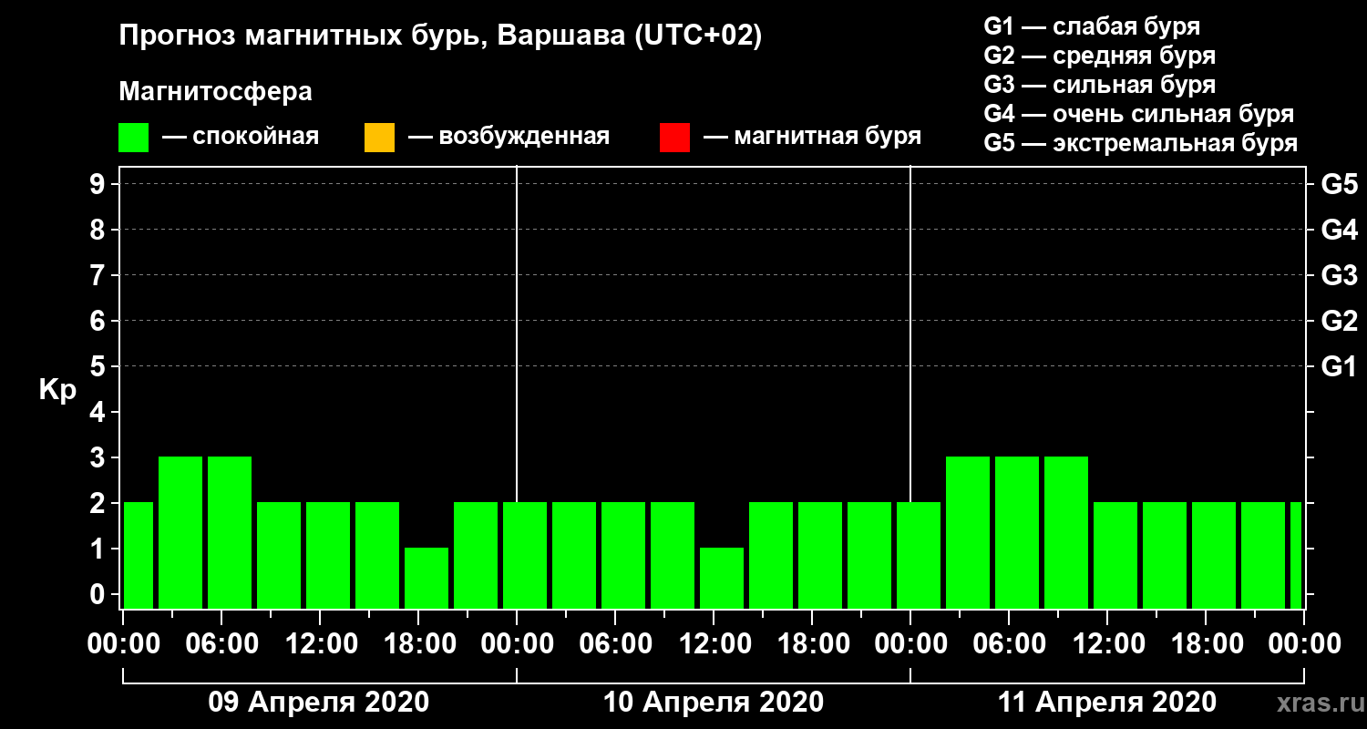 Прогноз магнитных бурь в Варшаве — 9 апреля 2020 года