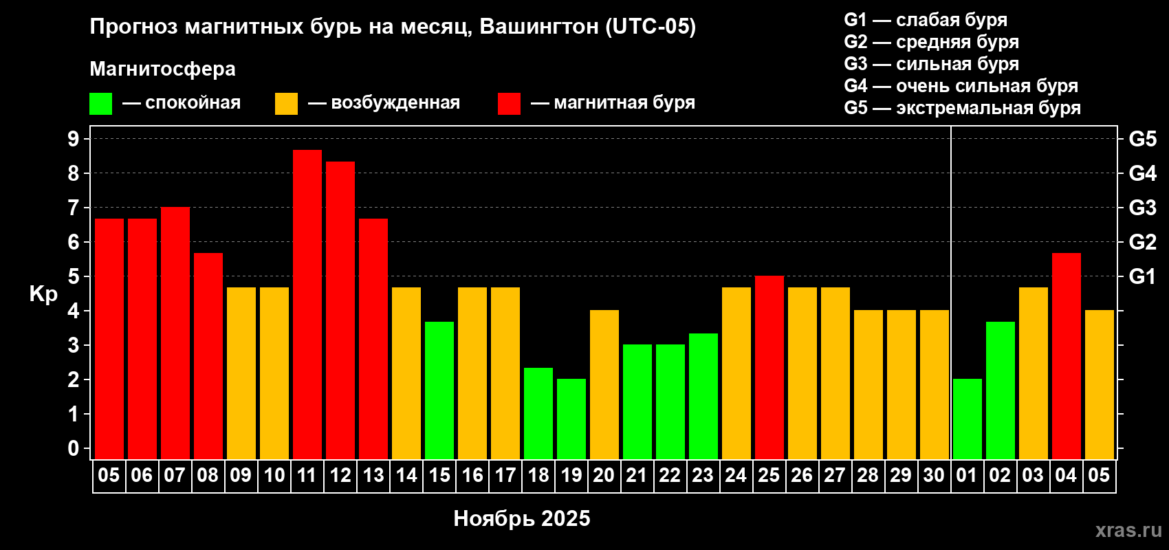 Прогноз магнитных бурь в Вашингтоне — 5 ноября 2025 года