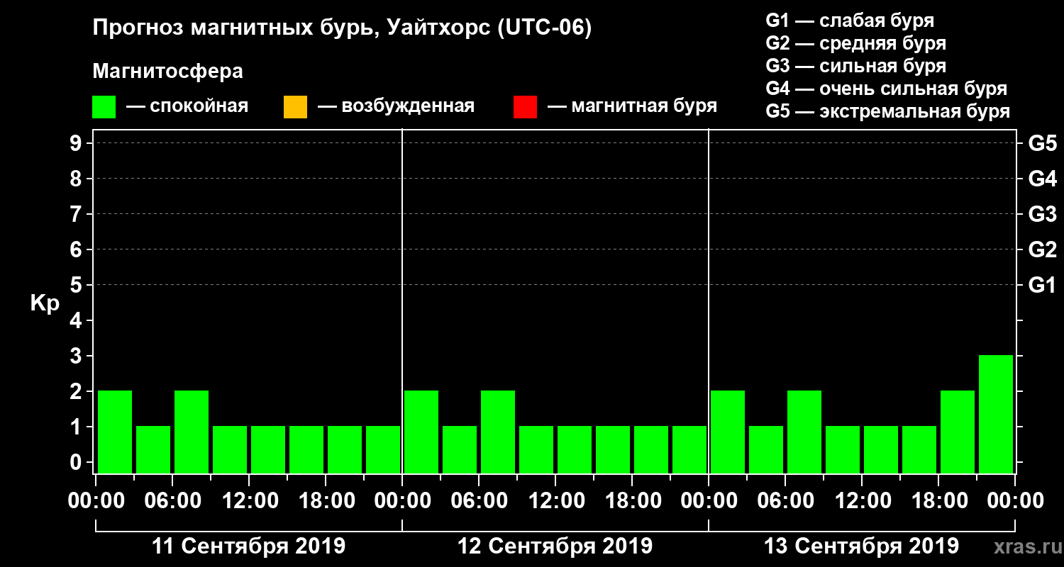 Прогноз магнитных бурь в Уайтхорсе на 11 сентября 2019 года