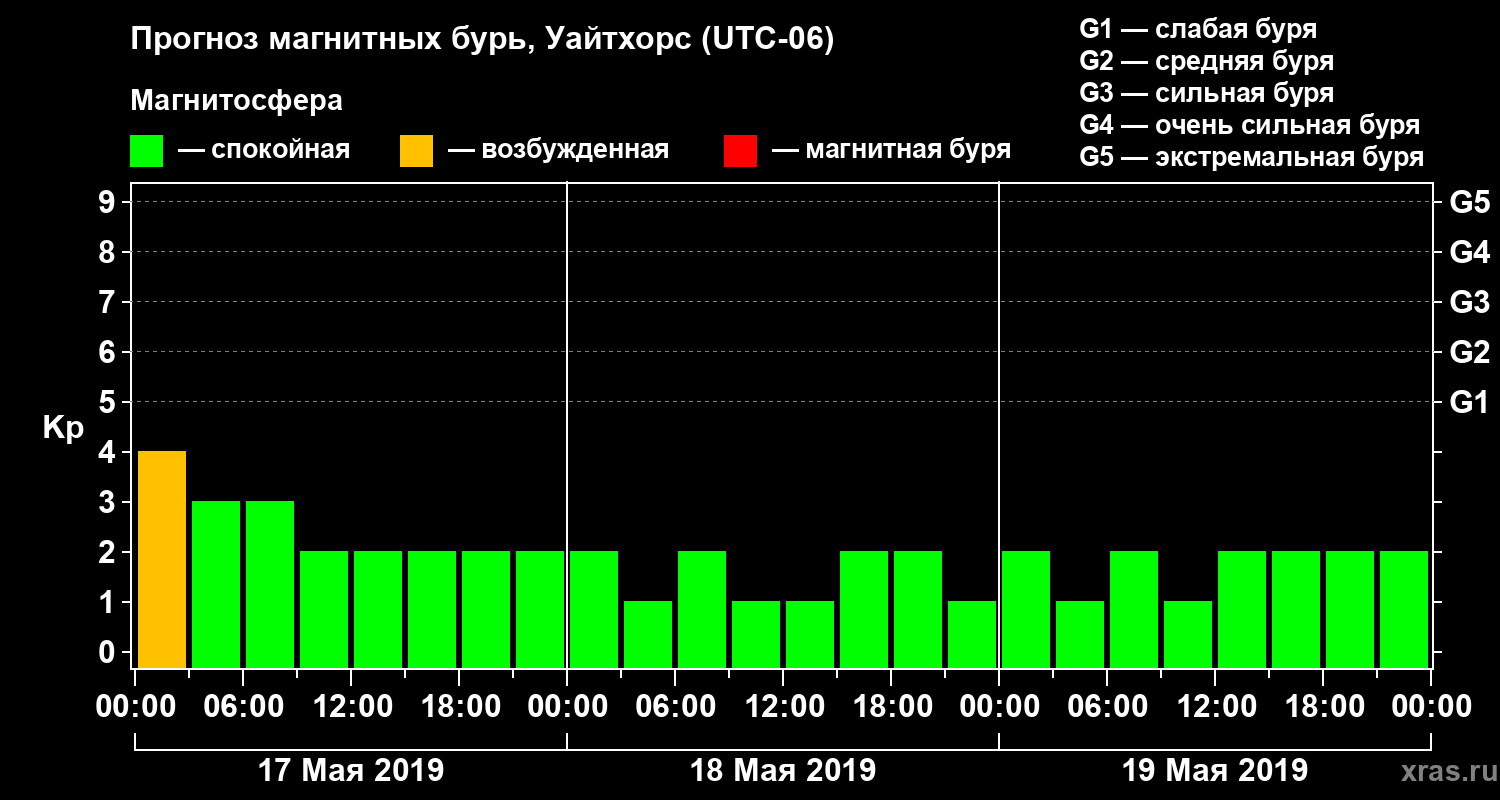Прогноз магнитных бурь в Уайтхорсе на 17 мая 2019 года