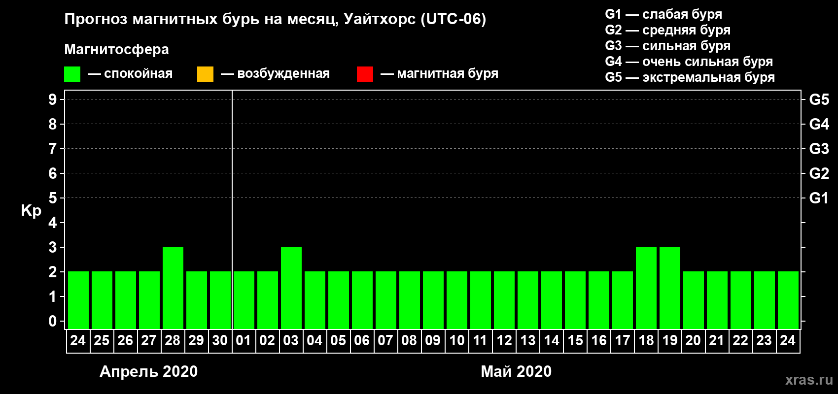 Прогноз магнитных бурь в Уайтхорсе — 24 апреля 2020 года