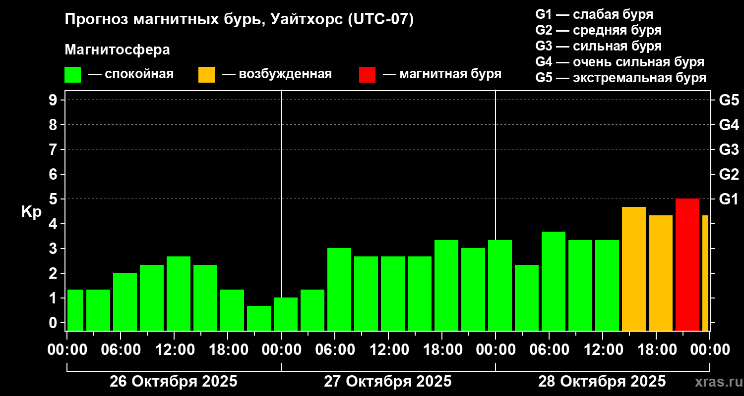 Прогноз магнитных бурь в Уайтхорсе на 26 октября 2025 года
