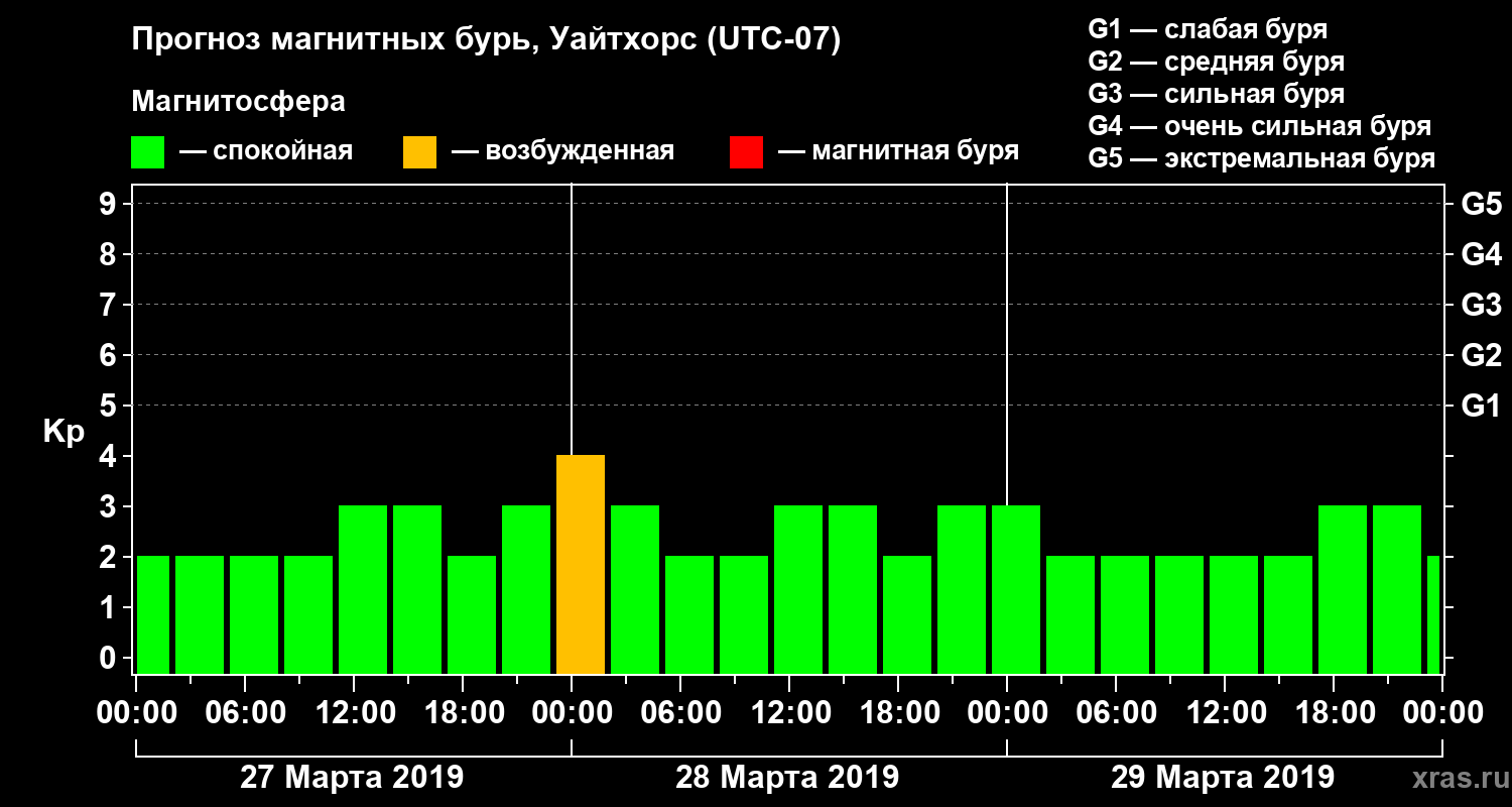 Прогноз магнитных бурь в Уайтхорсе — 27 марта 2019 года
