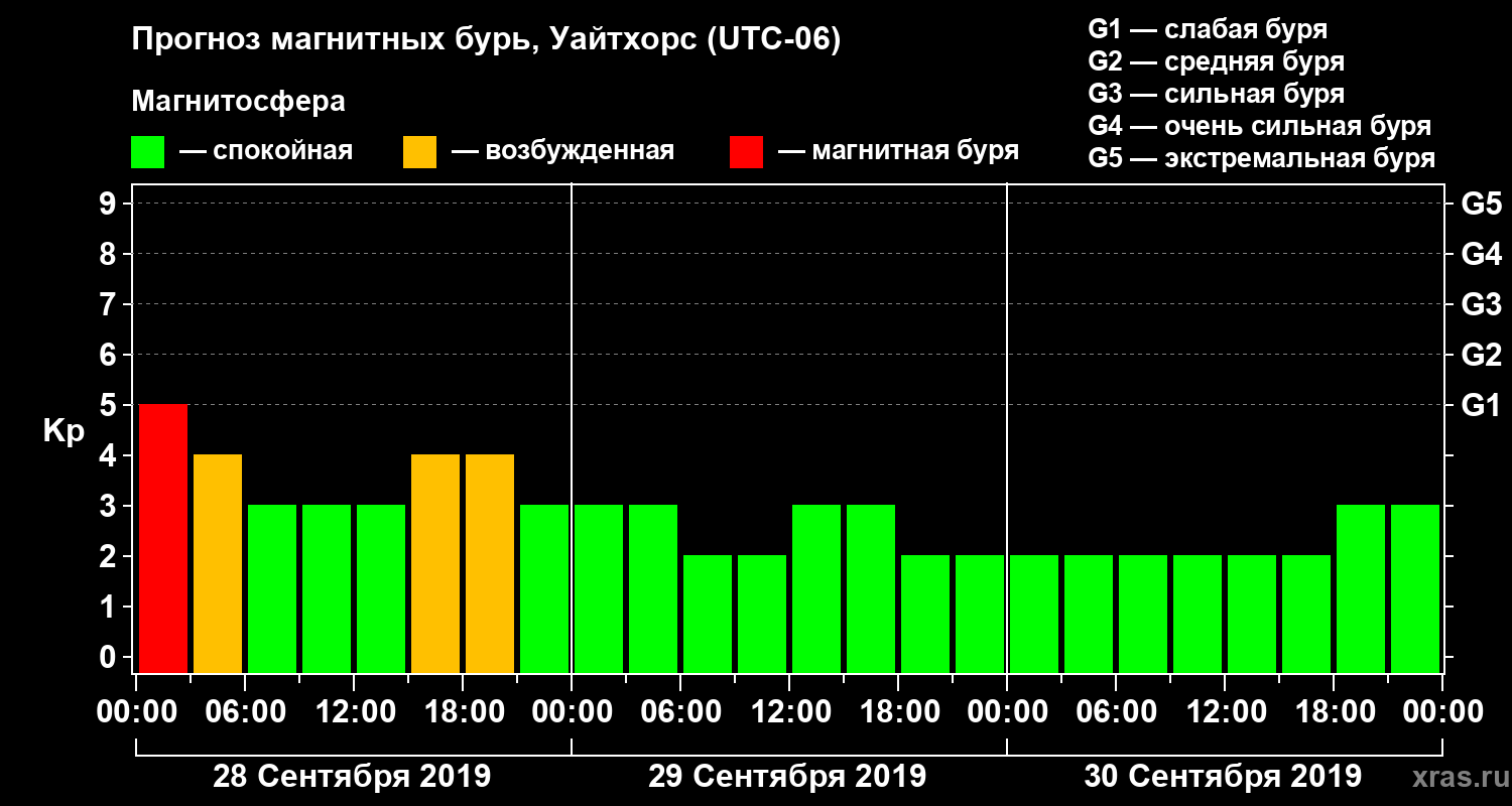 Прогноз магнитных бурь в Уайтхорсе — 28 сентября 2019 года
