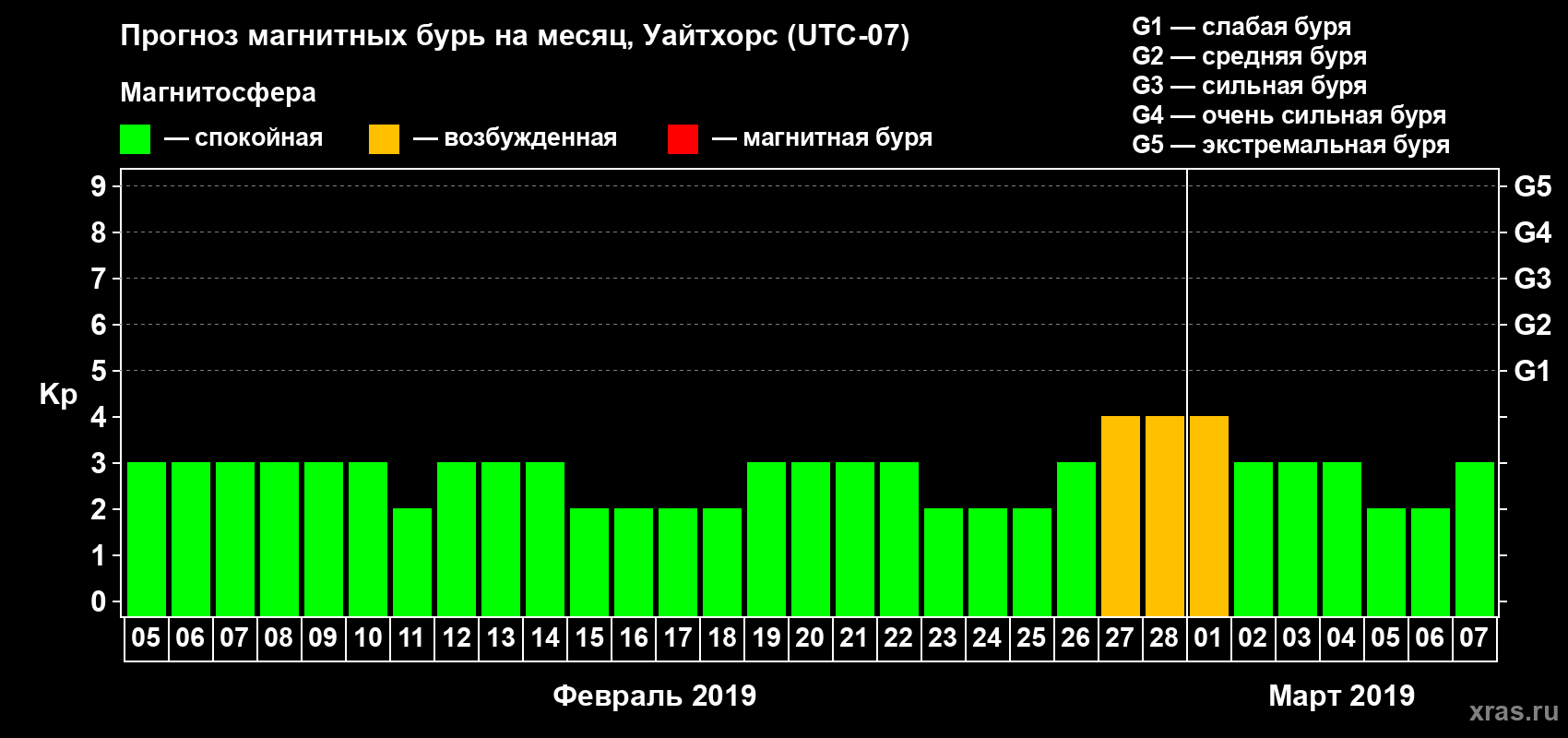 Прогноз магнитных бурь в Уайтхорсе на 5 февраля 2019 года