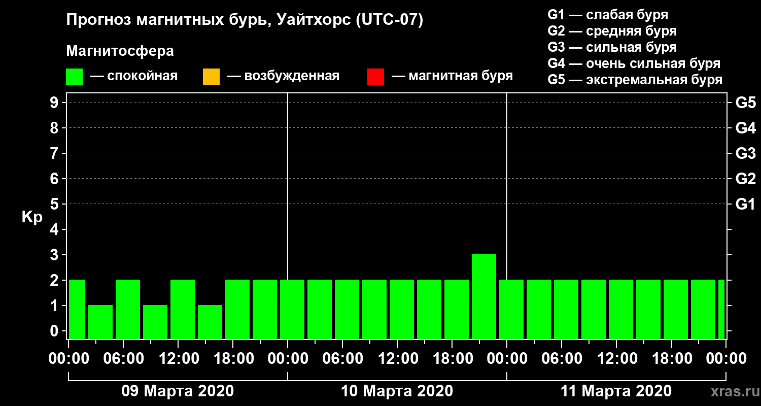 Прогноз магнитных бурь в Уайтхорсе — 9 марта 2020 года