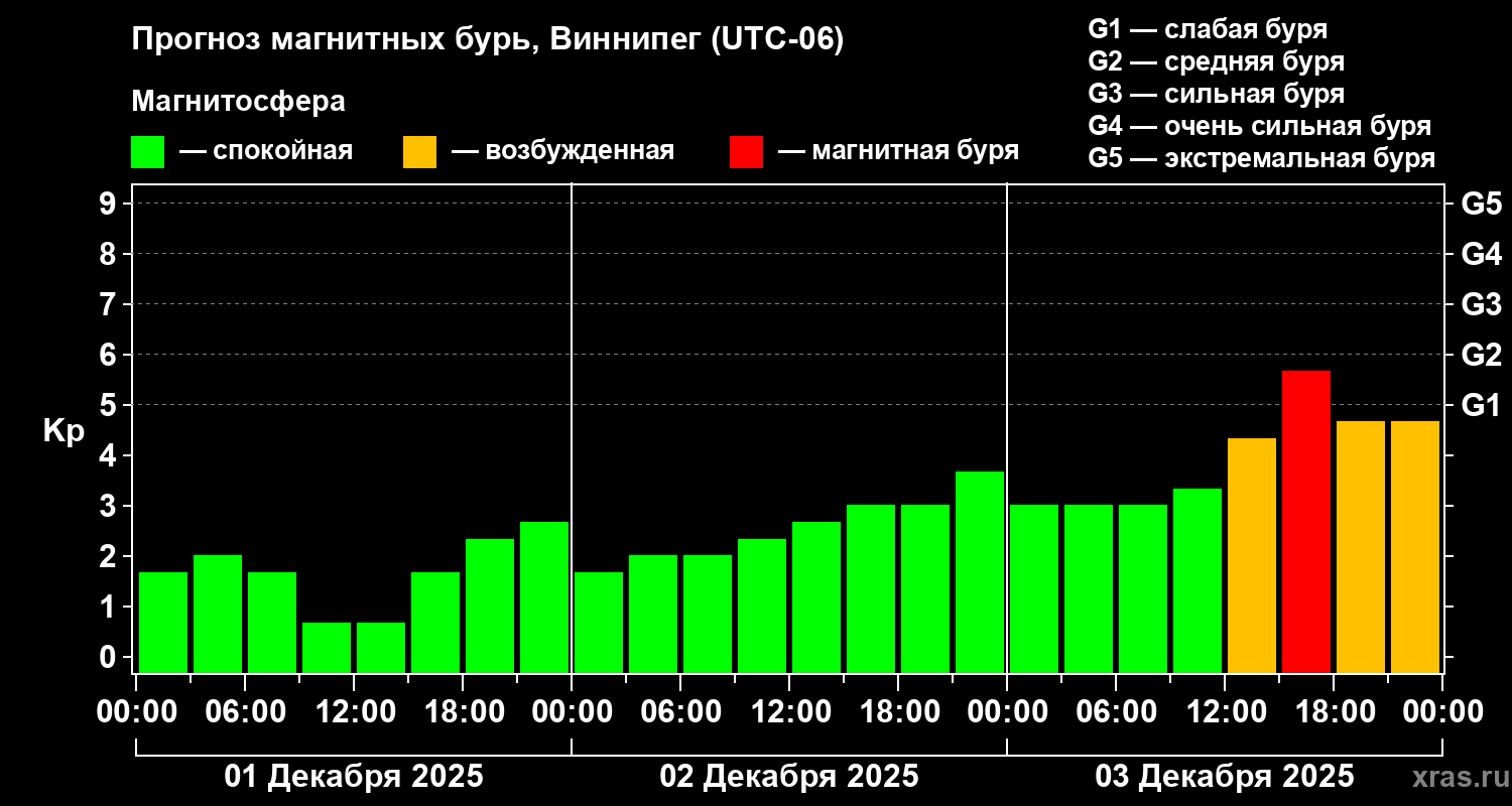 Прогноз магнитных бурь в Виннипеге — 1 декабря 2025 года