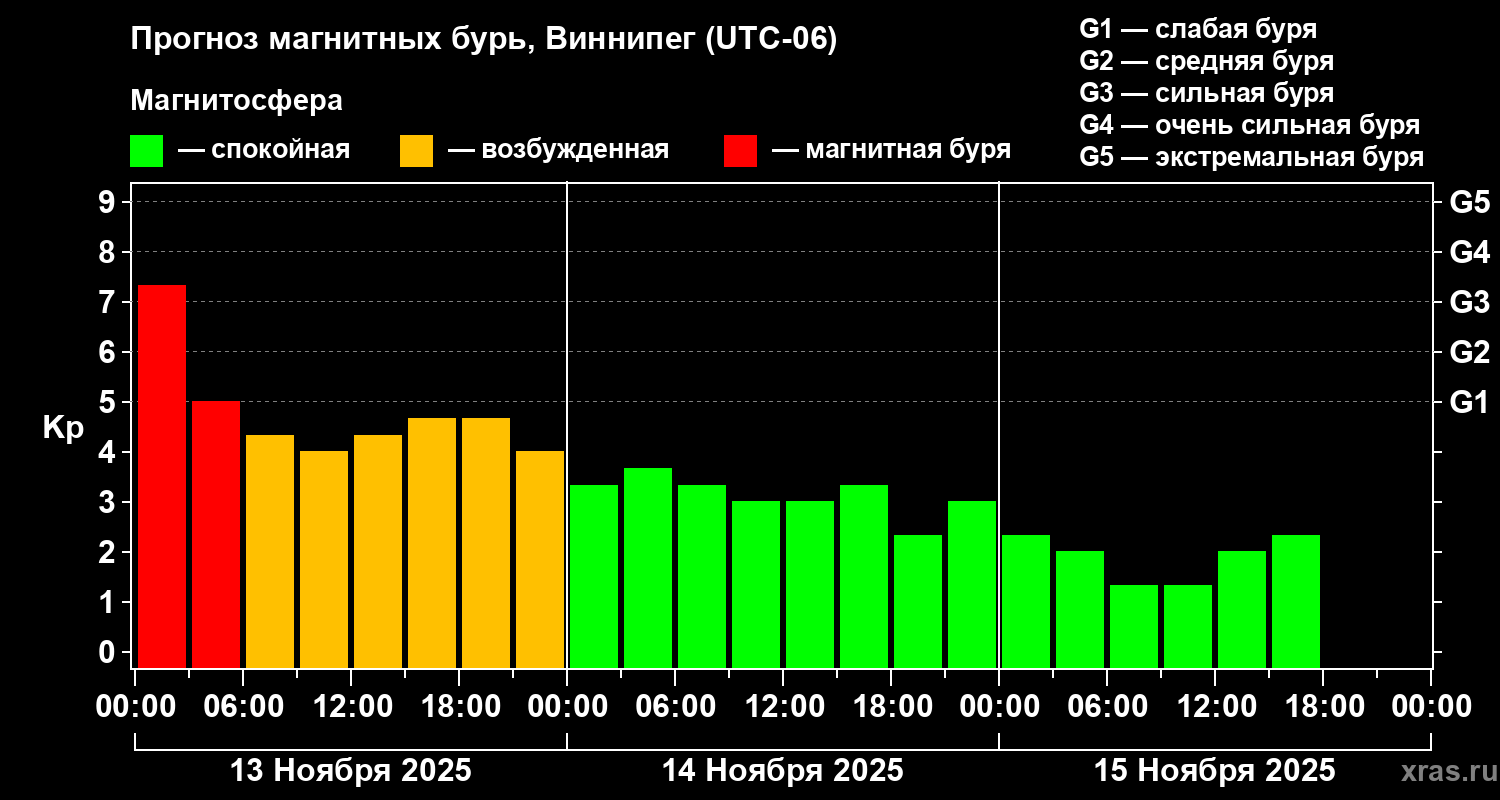 Прогноз магнитных бурь в Виннипеге на 13 ноября 2025 года