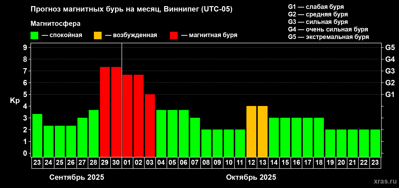 Прогноз магнитных бурь в Виннипеге на 23 сентября 2025 года