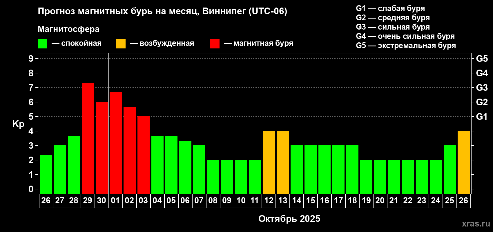 Прогноз магнитных бурь в Виннипеге — 26 сентября 2025 года
