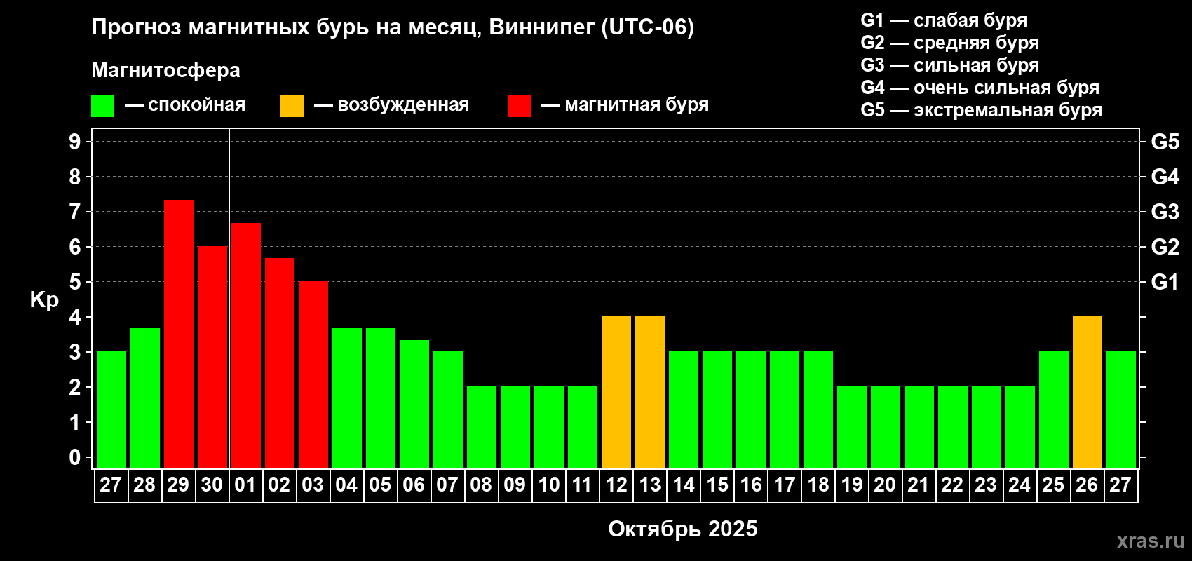 Прогноз магнитных бурь в Виннипеге на 27 сентября 2025 года