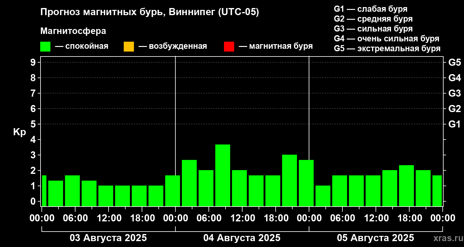 Прогноз магнитных бурь в Виннипеге на 3 августа 2025 года