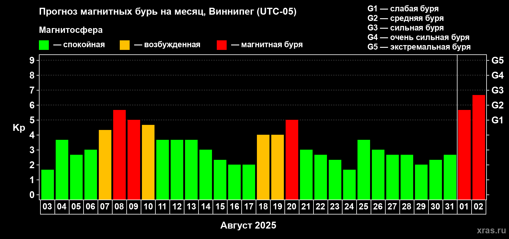 Прогноз магнитных бурь в Виннипеге — 3 августа 2025 года