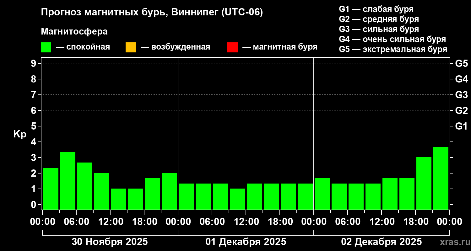 Прогноз магнитных бурь в Виннипеге на 30 ноября 2025 года