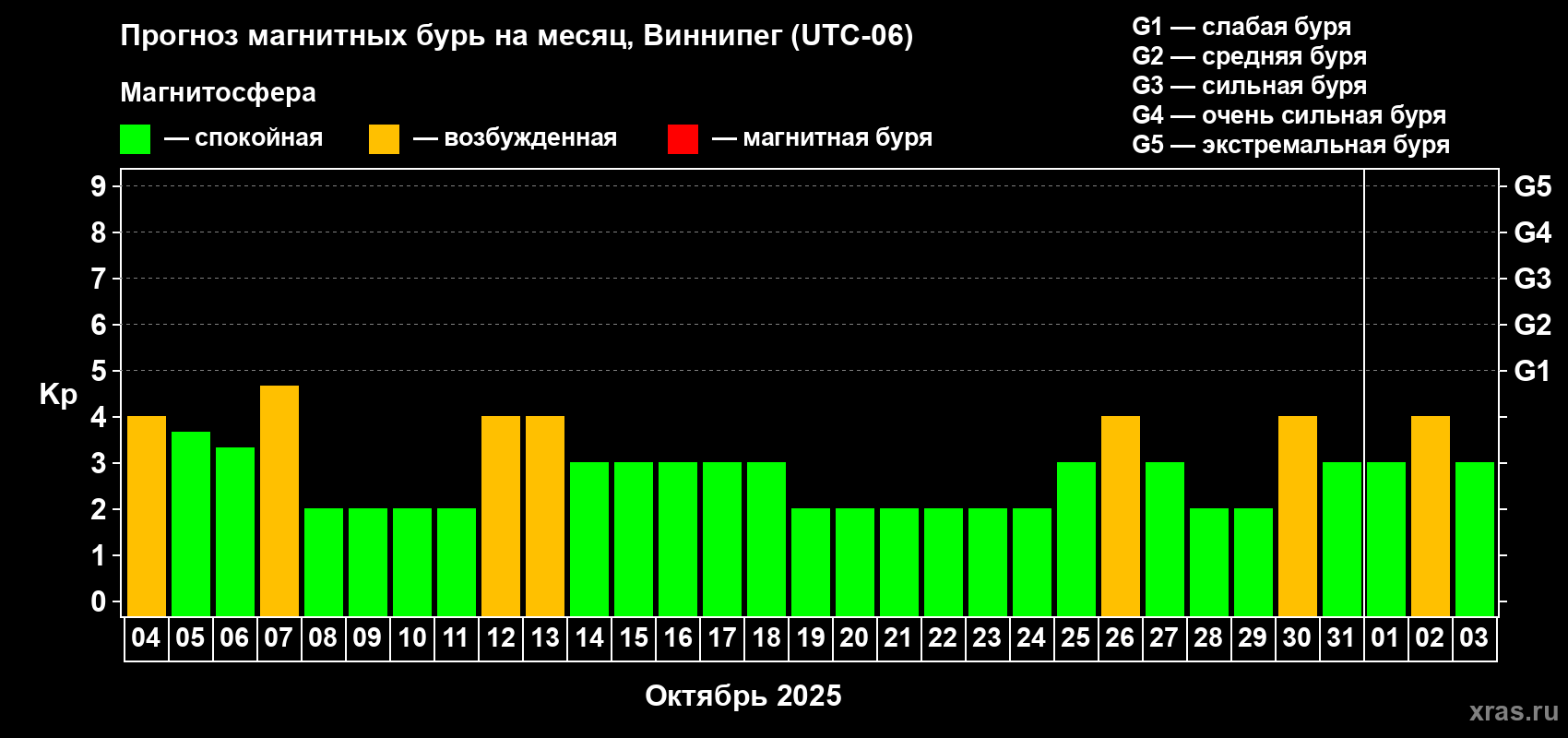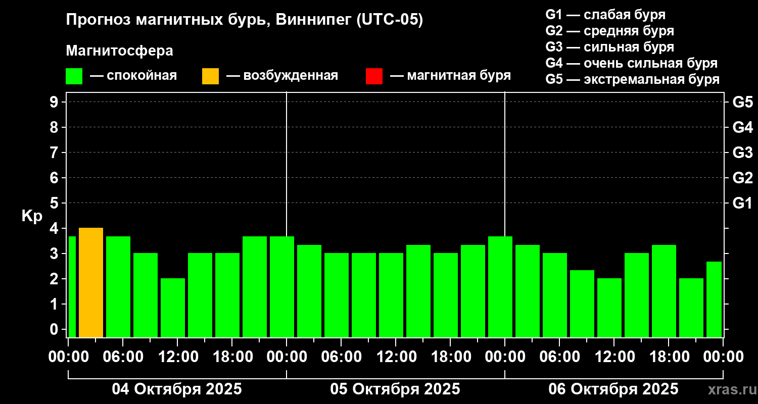 Прогноз магнитных бурь в Виннипеге — 4 октября 2025 года