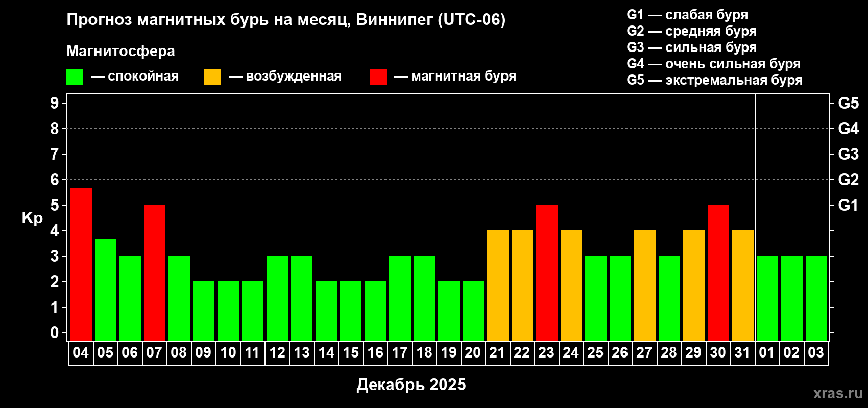 Прогноз магнитных бурь в Виннипеге — 4 декабря 2025 года