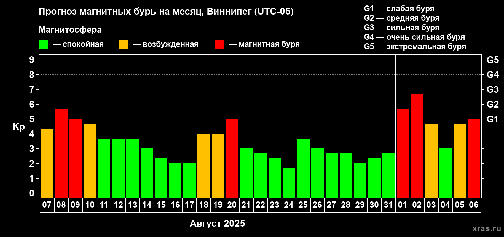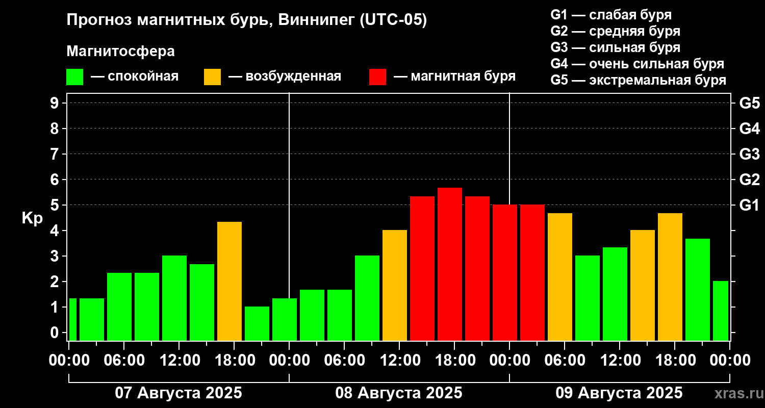Прогноз магнитных бурь в Виннипеге — 7 августа 2025 года