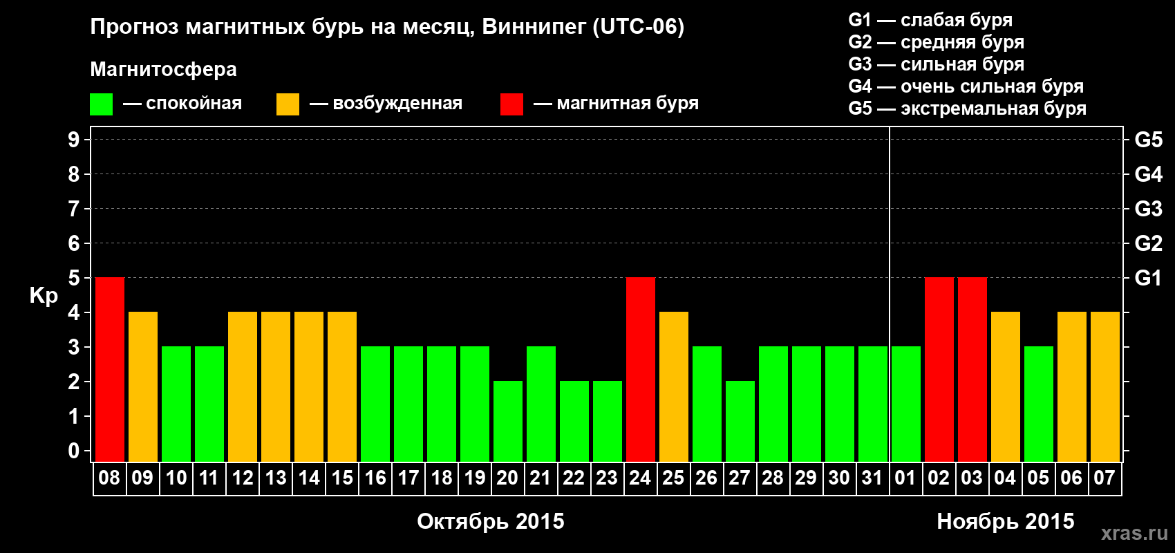 Прогноз магнитных бурь в Виннипеге — 8 октября 2015 года