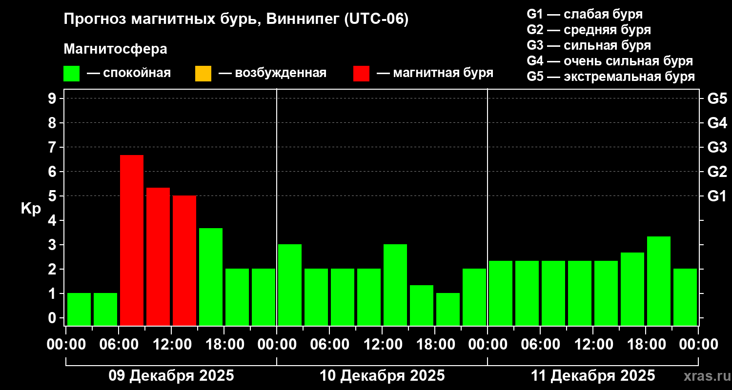 Прогноз магнитных бурь в Виннипеге на 9 декабря 2025 года