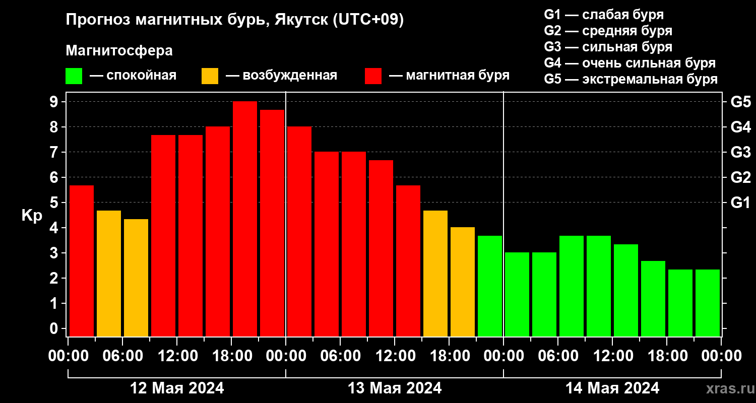 Прогноз магнитных бурь в Якутске — 12 мая 2024 года