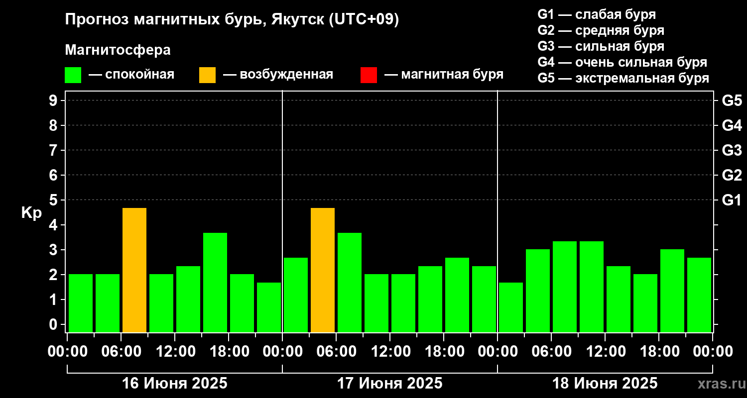 Прогноз магнитных бурь в Якутске на 16 июня 2025 года