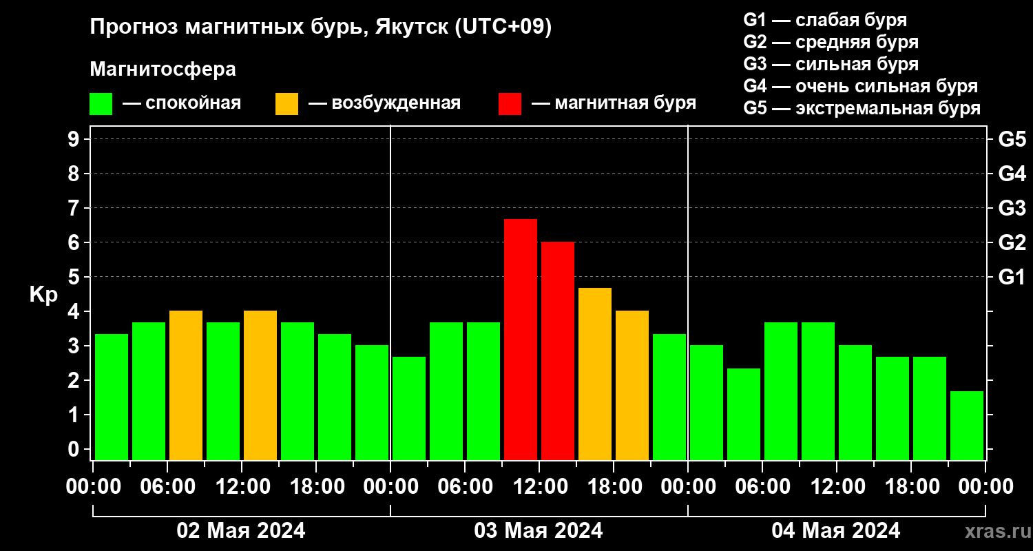 Прогноз магнитных бурь в Якутске — 2 мая 2024 года