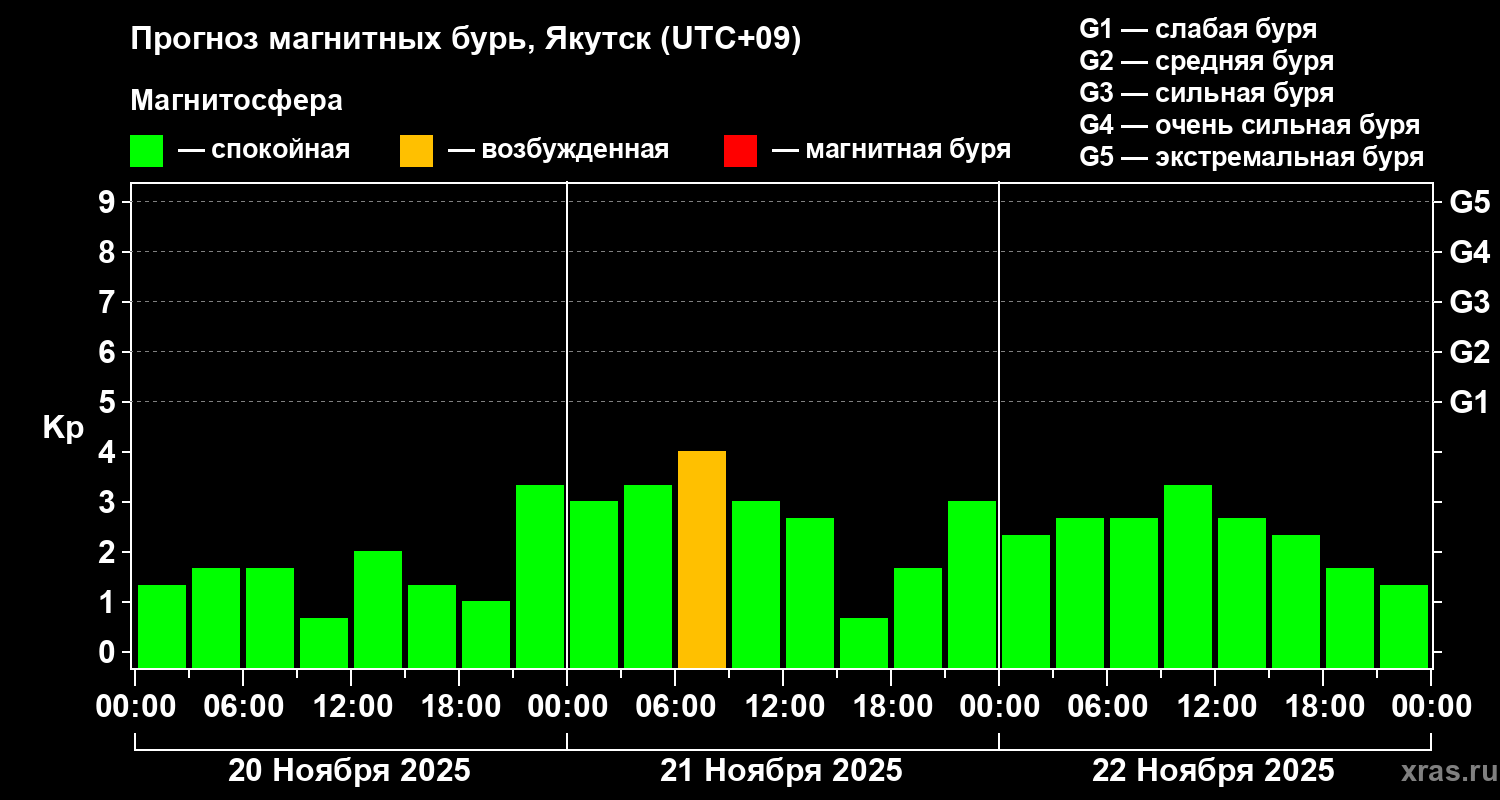 Прогноз магнитных бурь в Якутске — 20 ноября 2025 года