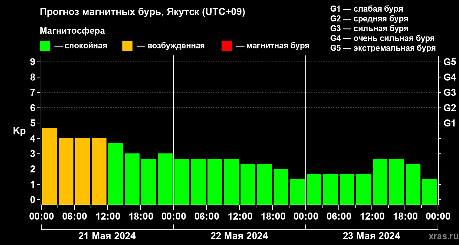 Прогноз магнитных бурь в Якутске — 21 мая 2024 года