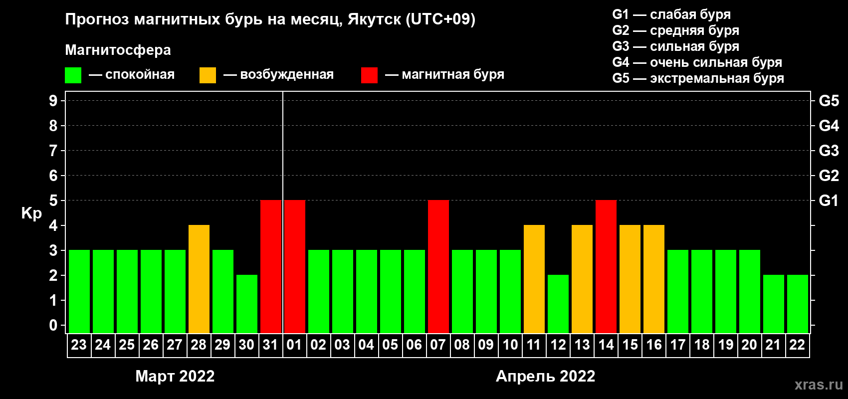 Прогноз магнитных бурь в Якутске на 23 марта 2022 года