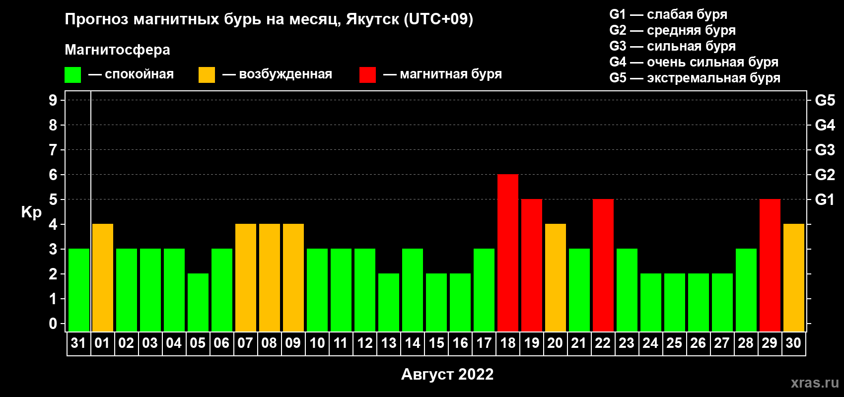 Прогноз магнитных бурь в Якутске — 31 июля 2022 года