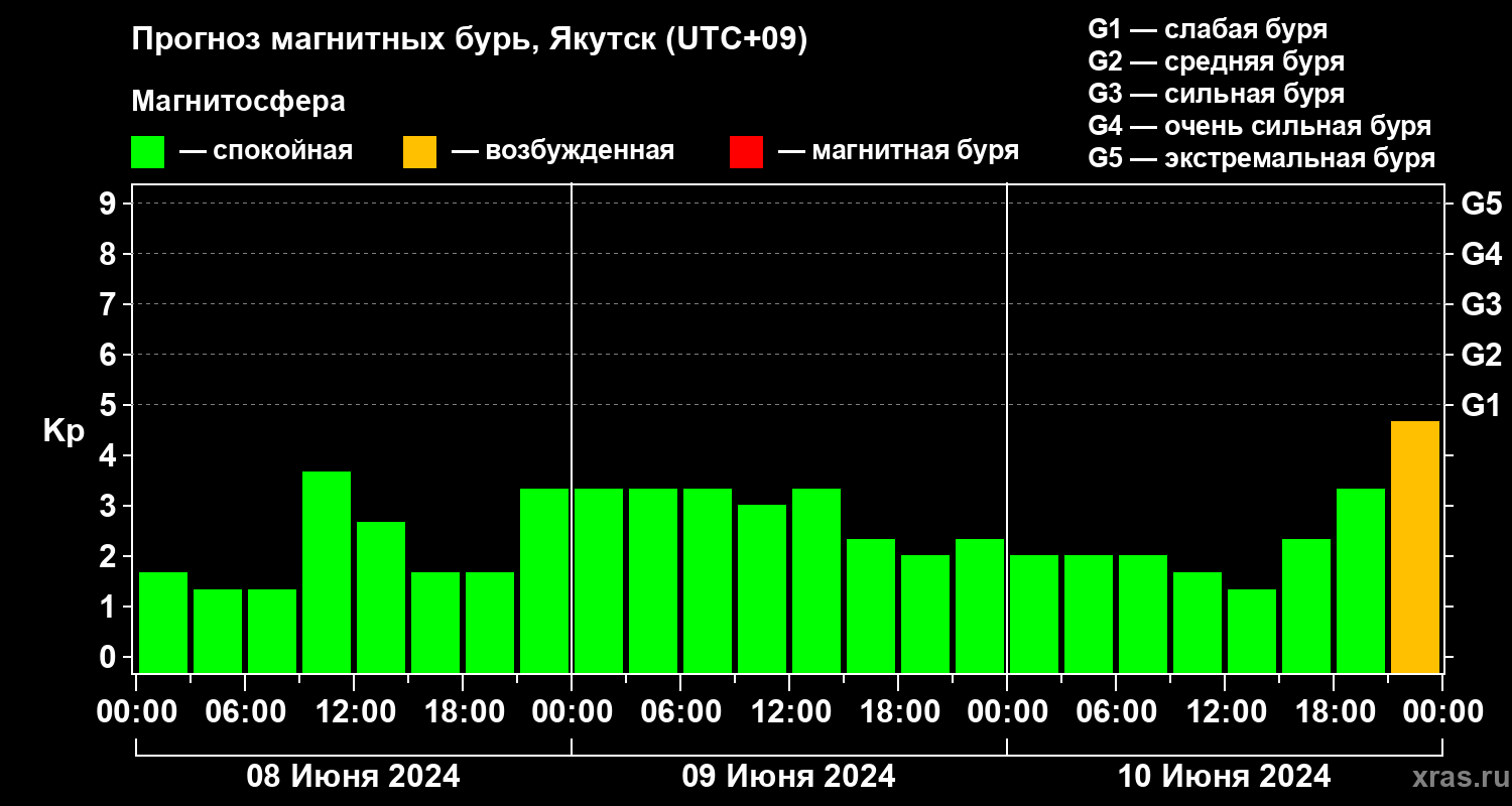 Прогноз магнитных бурь в Якутске — 8 июня 2024 года