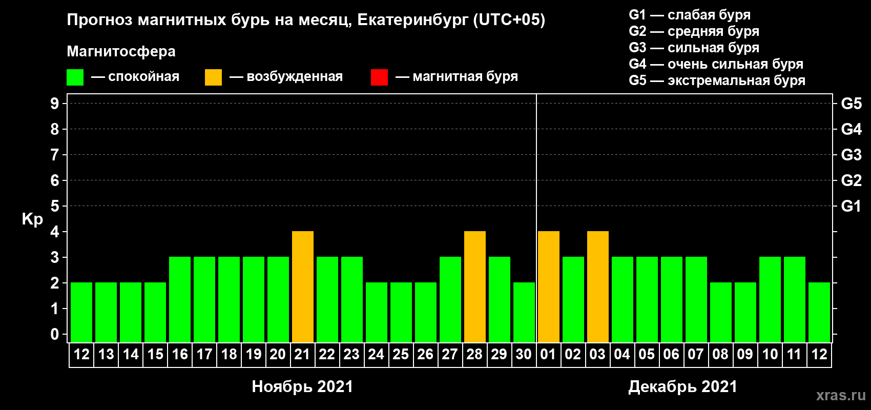 Прогноз магнитных бурь в Екатеринбурге на 12 ноября 2021 года