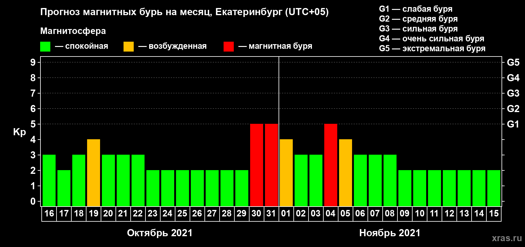 Прогноз магнитных бурь в Екатеринбурге — 16 октября 2021 года