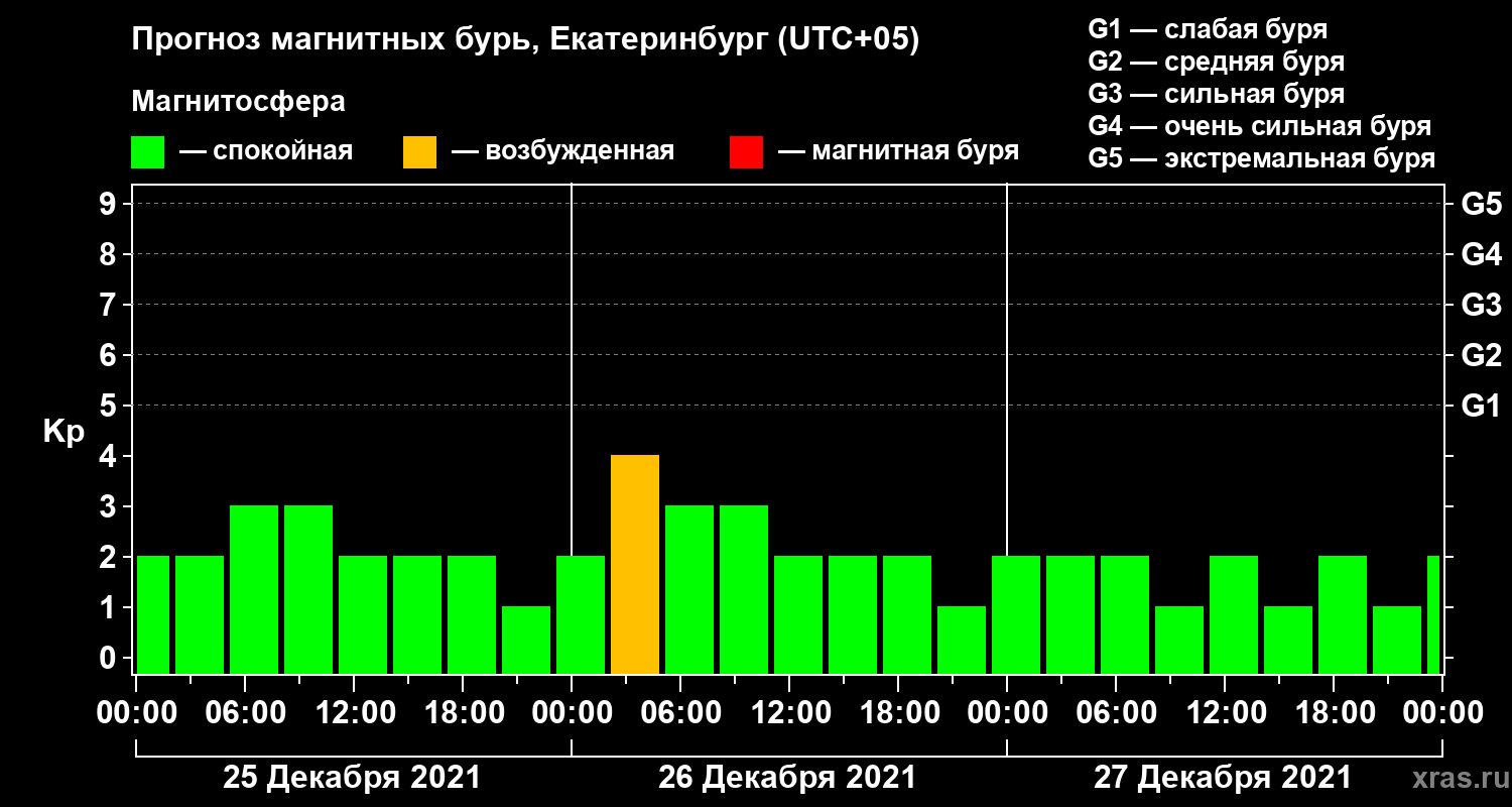 Прогноз магнитных бурь в Екатеринбурге — 25 декабря 2021 года