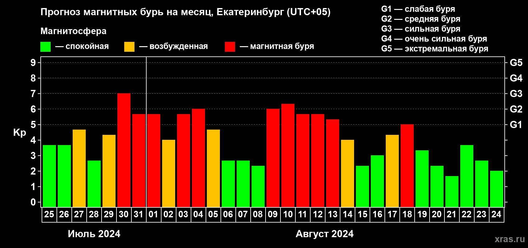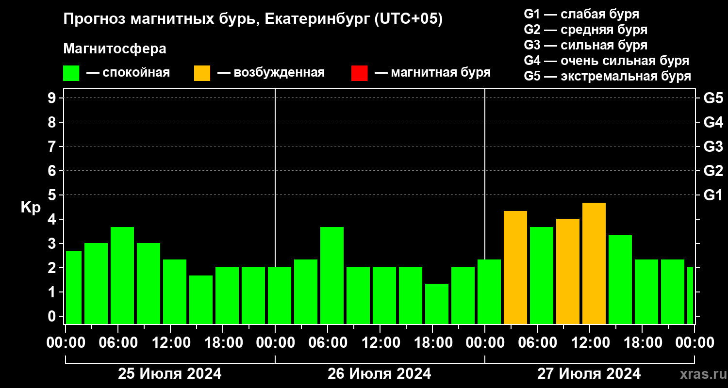 Прогноз магнитных бурь в Екатеринбурге — 25 июля 2024 года