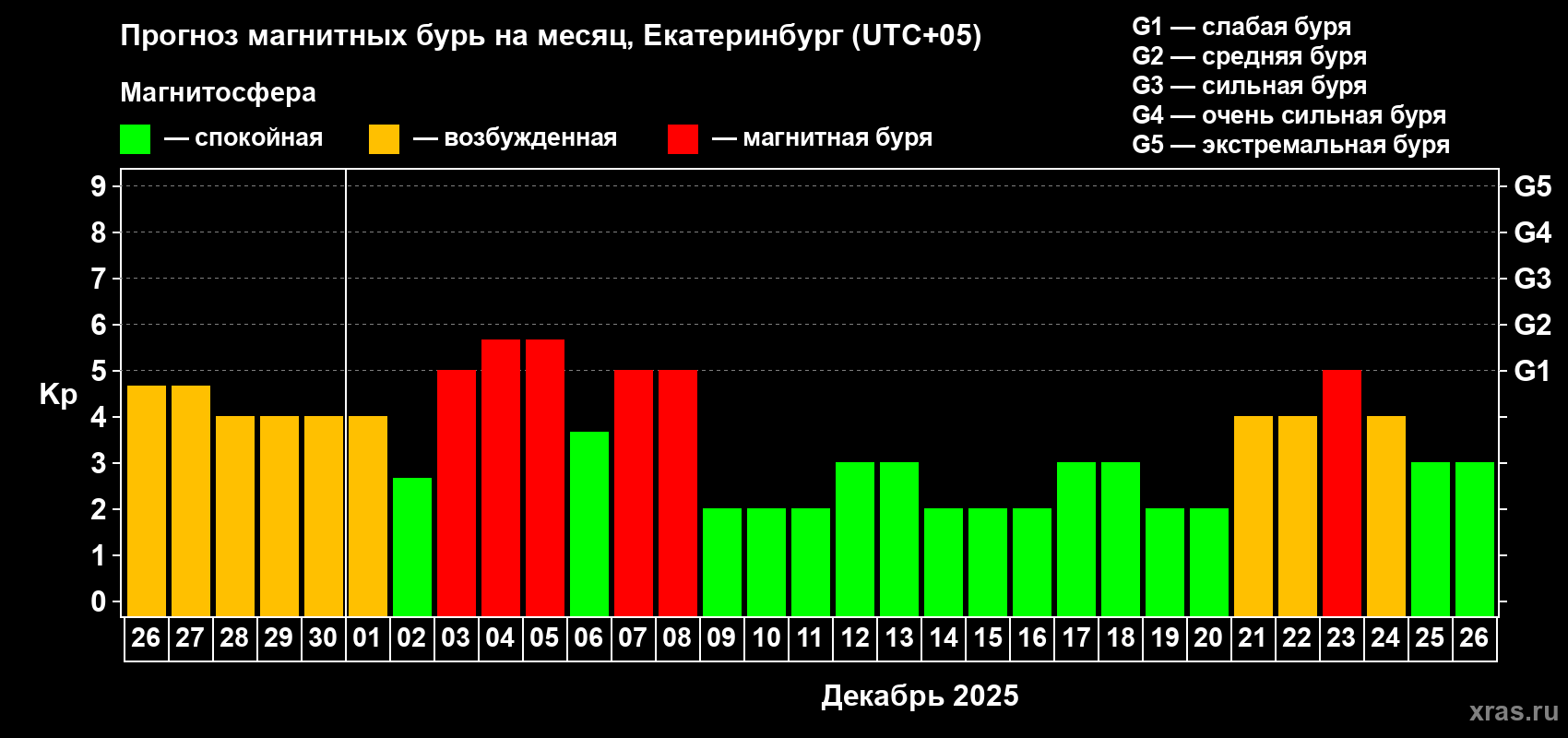 Прогноз магнитных бурь в Екатеринбурге — 26 ноября 2025 года