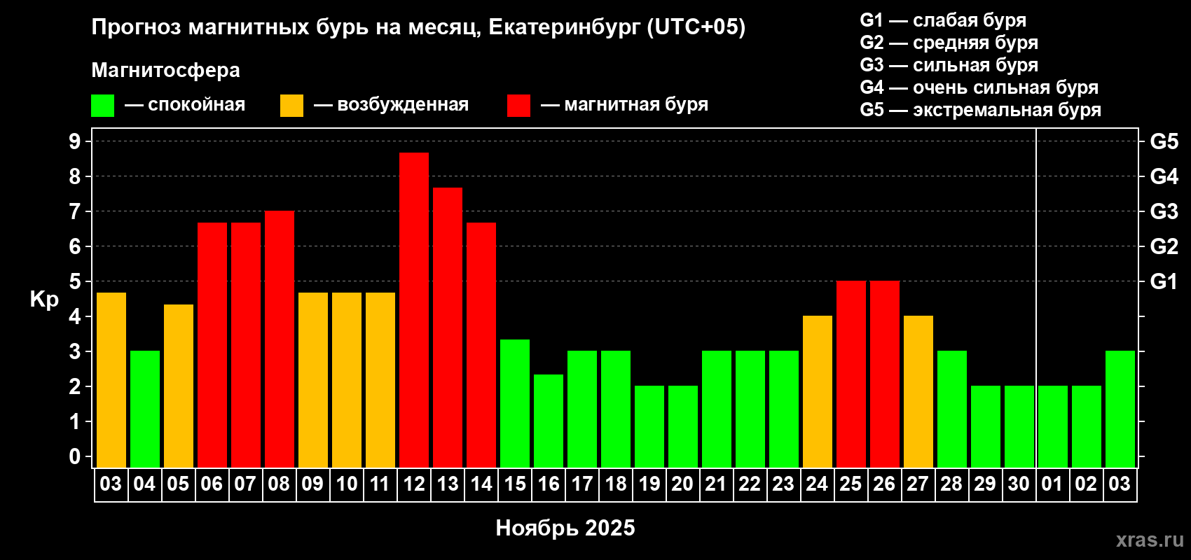 Прогноз магнитных бурь в Екатеринбурге — 3 ноября 2025 года