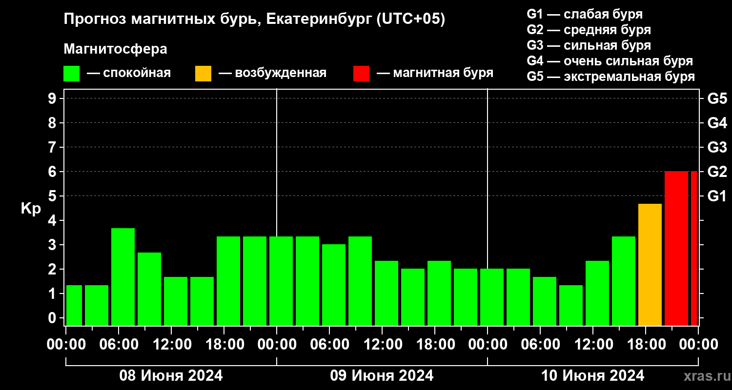 Прогноз магнитных бурь в Екатеринбурге на 8 июня 2024 года
