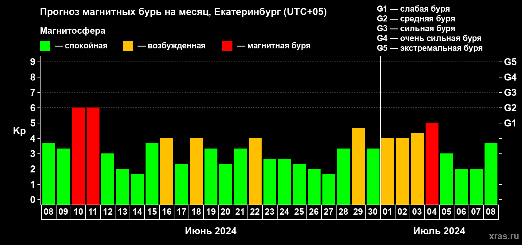 Прогноз магнитных бурь в Екатеринбурге — 8 июня 2024 года
