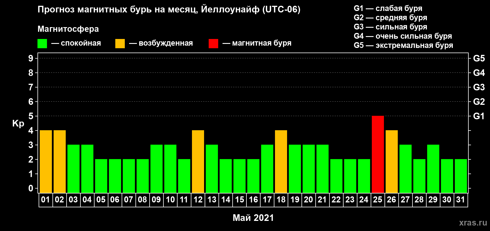 Прогноз магнитных бурь в Йеллоунайфе на 1 мая 2021 года