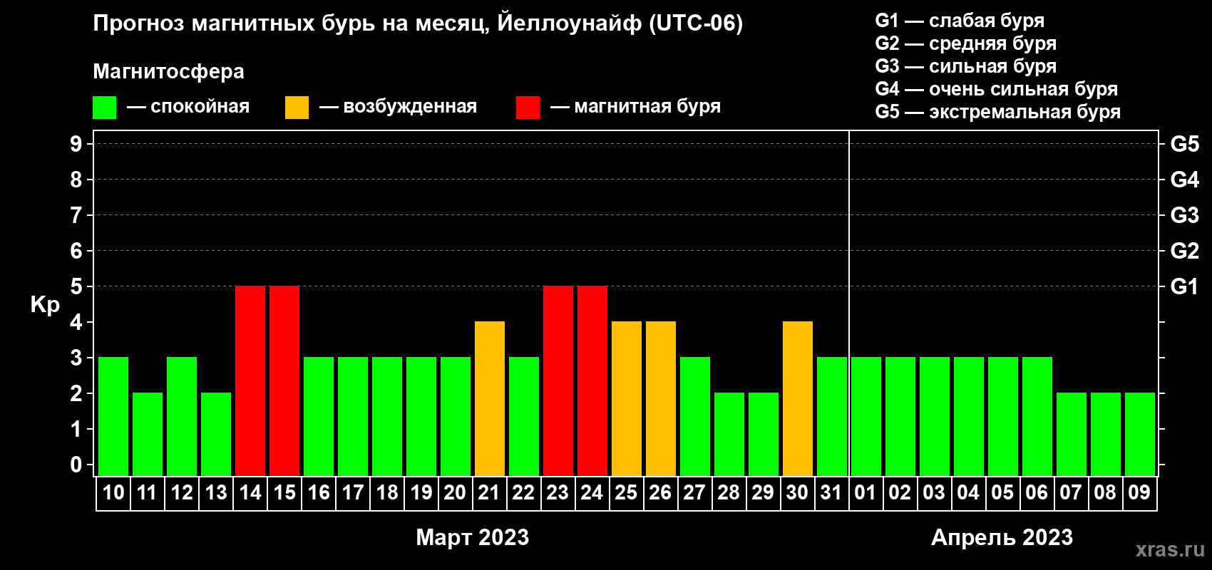 Прогноз магнитных бурь в Йеллоунайфе на 10 марта 2023 года