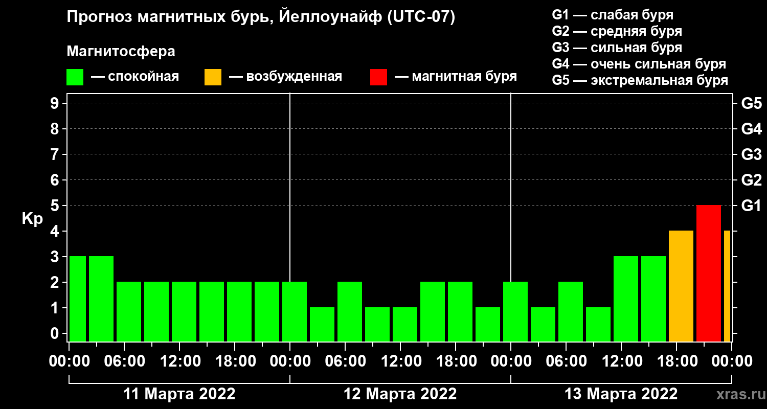 Прогноз магнитных бурь в Йеллоунайфе на 11 марта 2022 года