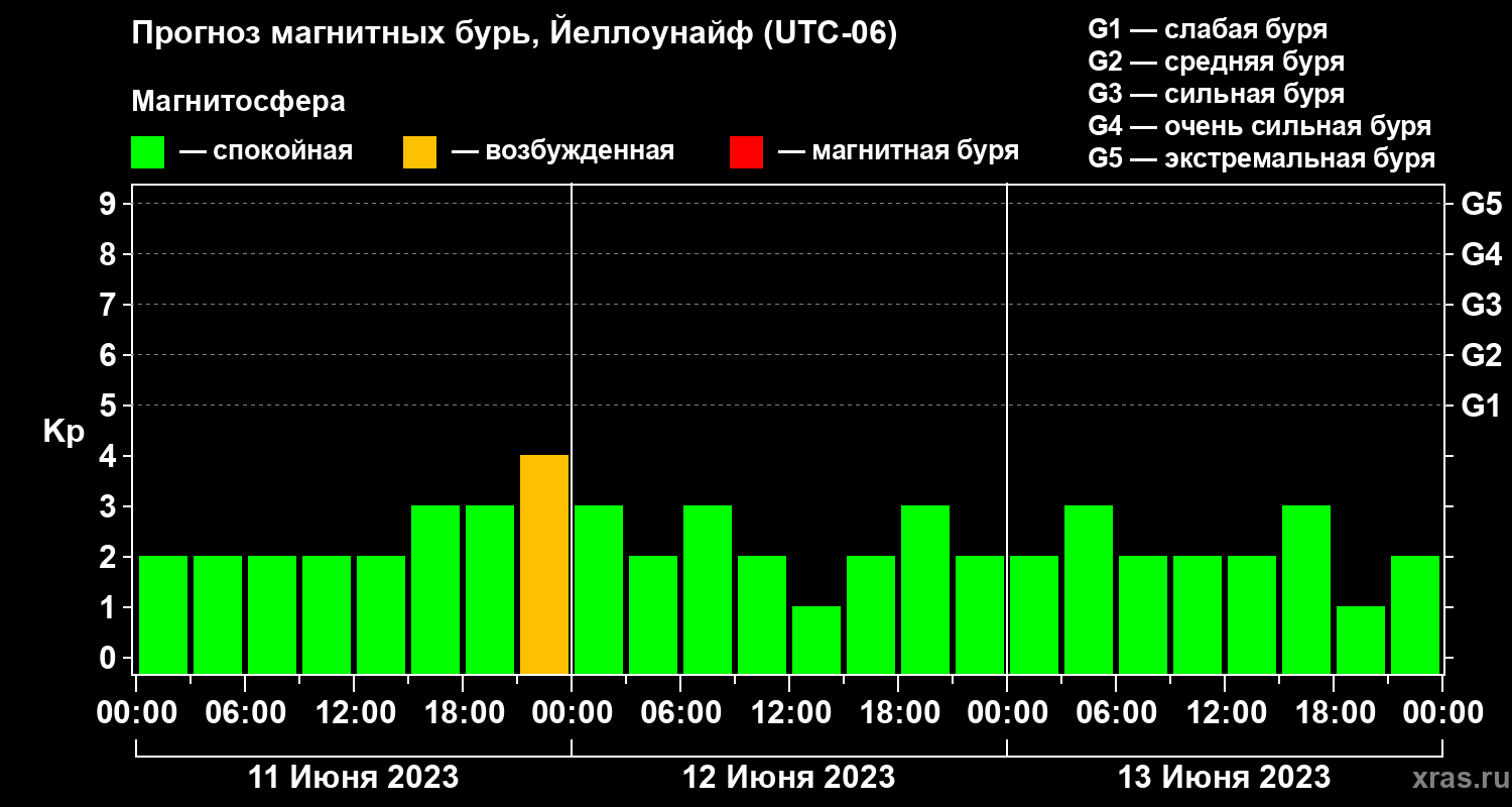 Прогноз магнитных бурь в Йеллоунайфе на 11 июня 2023 года