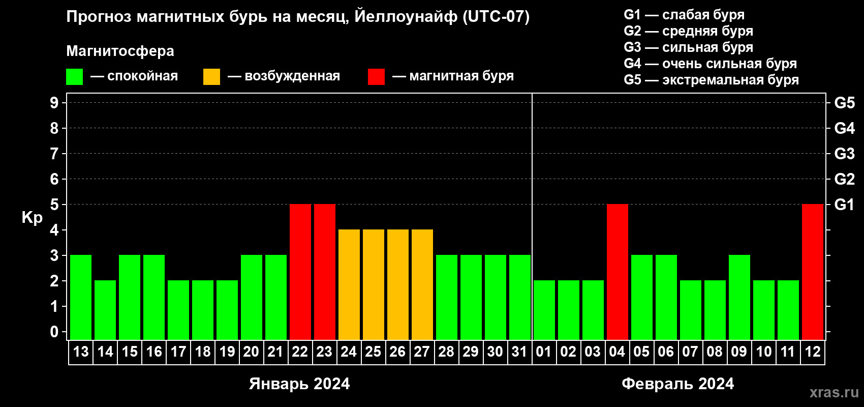 Прогноз магнитных бурь в Йеллоунайфе — 13 января 2024 года