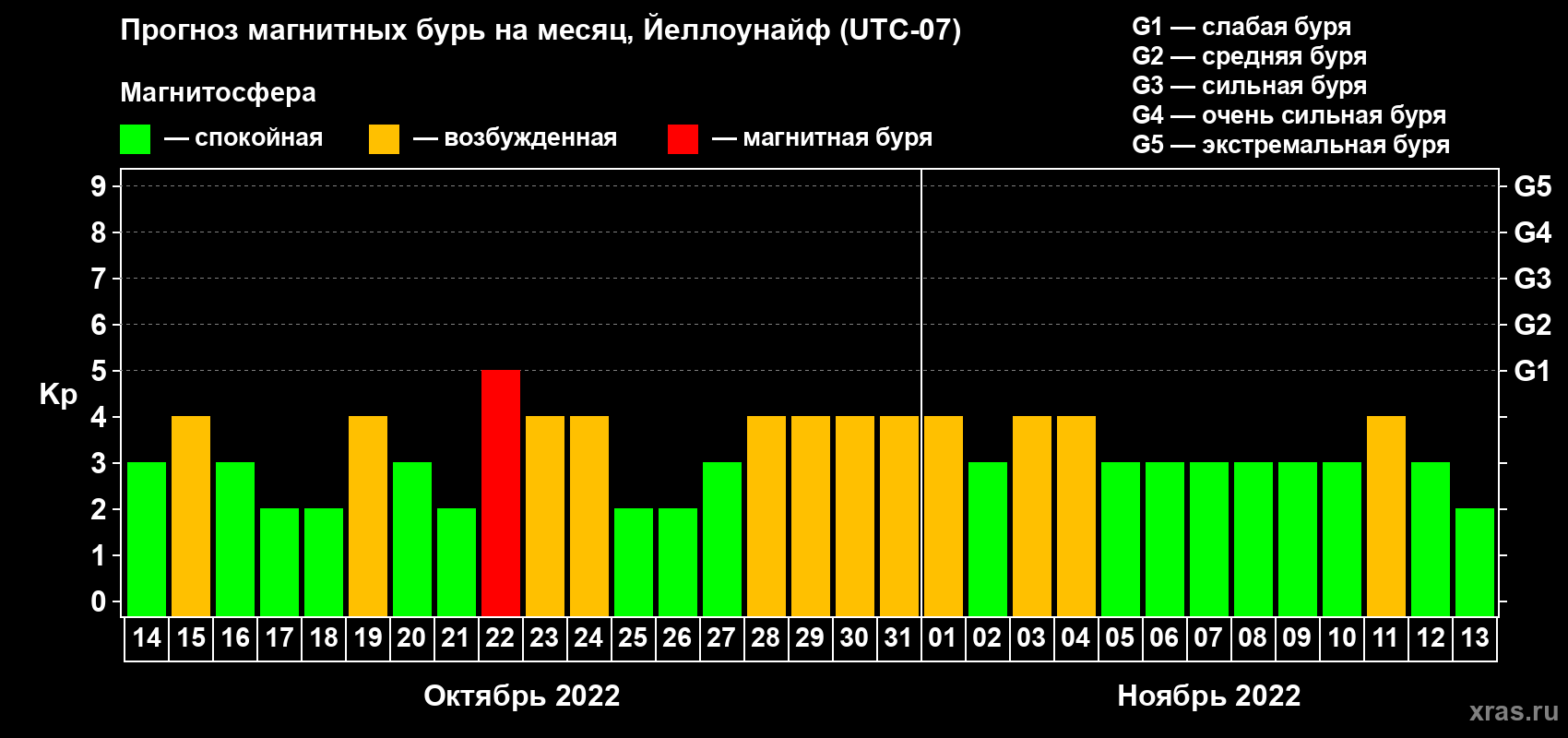 Прогноз магнитных бурь в Йеллоунайфе на 14 октября 2022 года