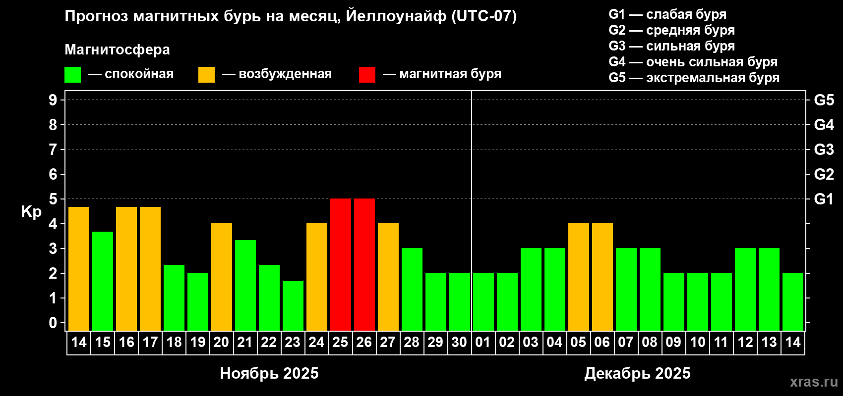 Прогноз магнитных бурь в Йеллоунайфе на 14 ноября 2025 года